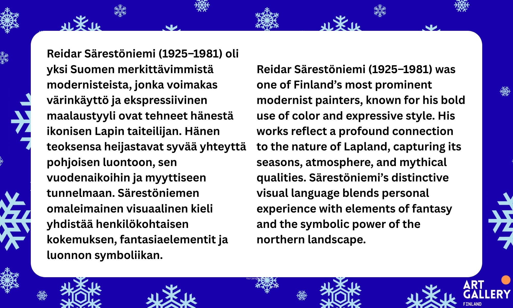 Reidar Särestöniemi taidenäyttely järjestetään osana Reidar Särestöniemi 100 -juhlavuotta Oulussa osoitteessa Torikatu 7, 90100 Oulu, ajalla 28.9.–30.12.2025. Näyttely on avoinna joka päivä klo 10 - 20.